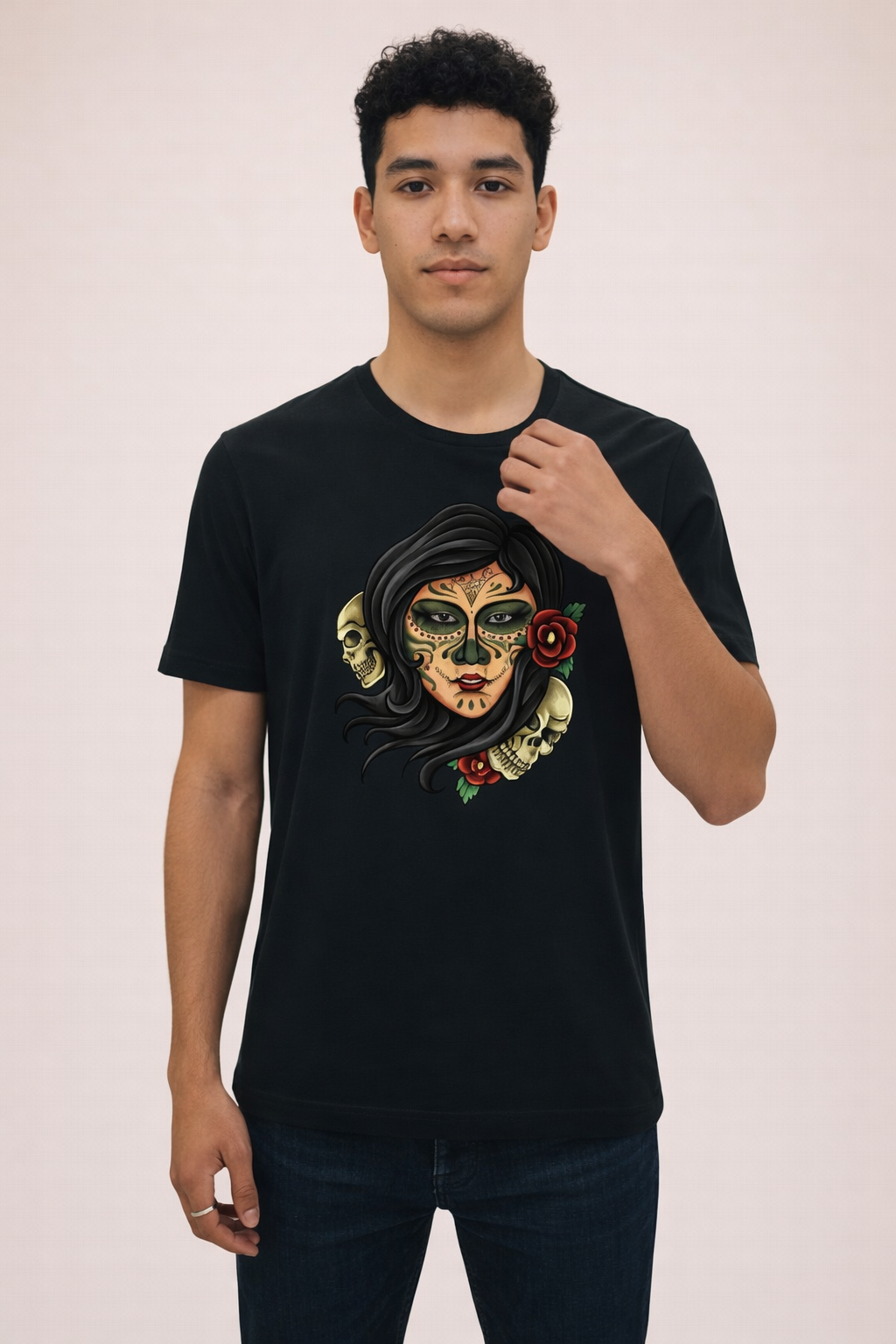 This T-shirt is a vibrant, respectful tribute to rich cultural art and a powerful fashion statement. It appeals to those who appreciate elaborate tattoo work, Gothic aesthetics, and the profound beauty of traditional Mexican folklore. It’s an unforgettable graphic piece perfect for adding depth and artistic edge to any wardrobe.