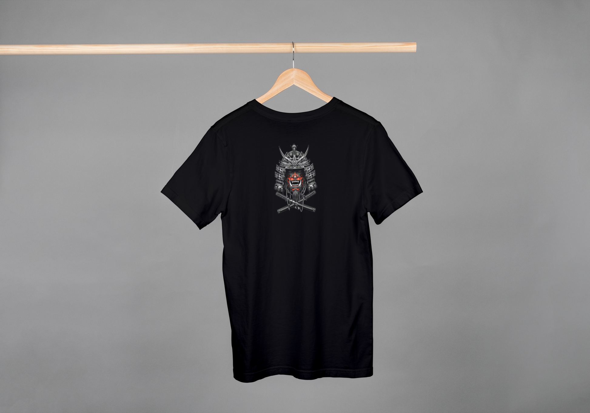 Unleash bold warrior energy with this Black Samurai Graphic T-Shirt, designed for those who love intense, highly detailed artwork. The front features a compact samurai mask design with crossed swords powerful, precise, and visually striking.