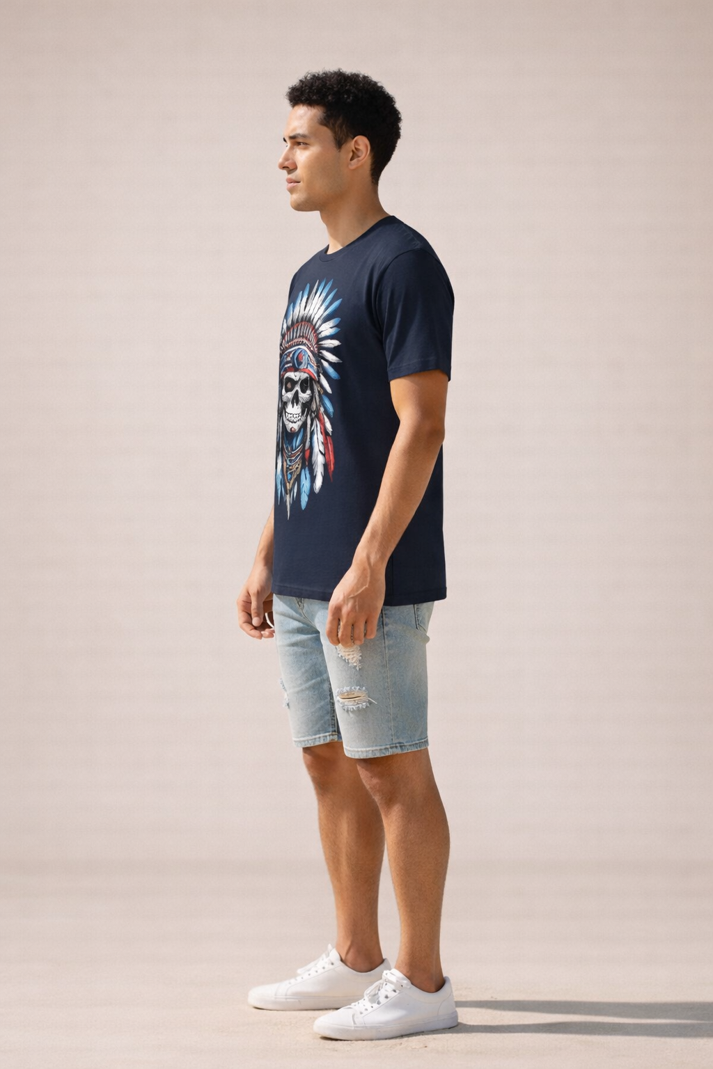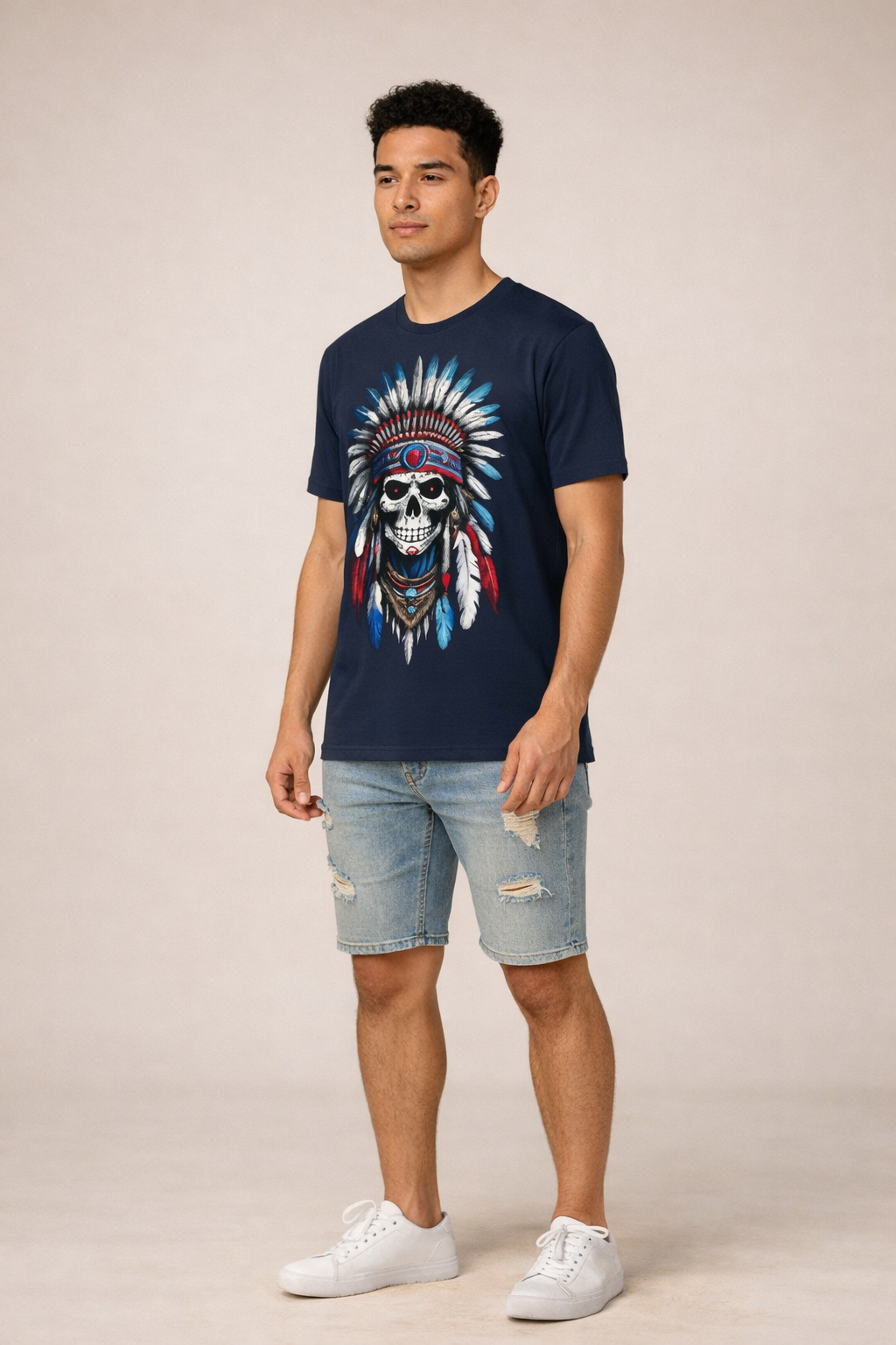 This bold graphic t-shirt features a striking tribal skull design adorned with a detailed feather headdress, blending raw streetwear energy with cultural-inspired artistry. Crafted from premium-quality cotton fabric, it offers a soft, breathable feel and a comfortable regular fit for everyday wear.