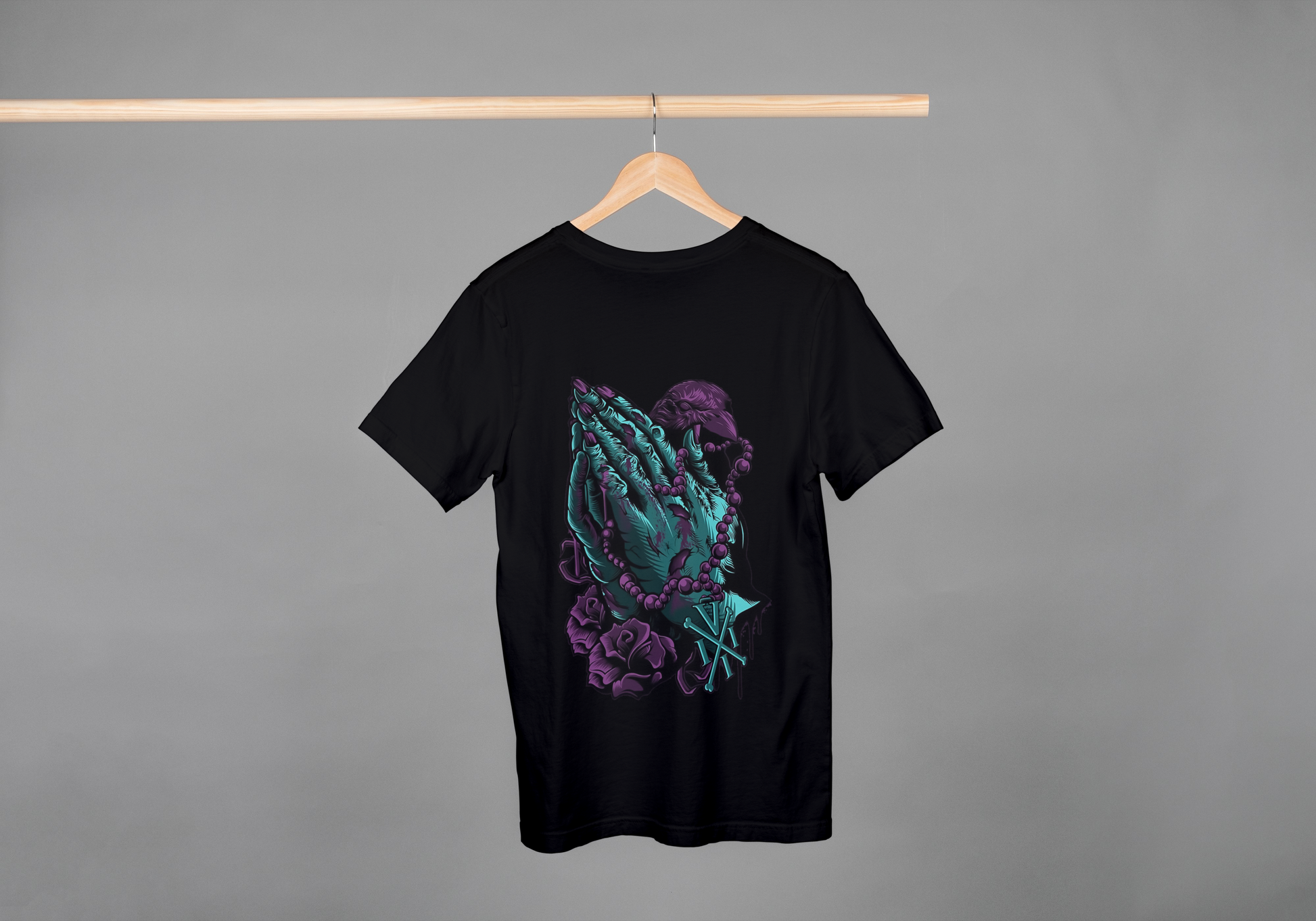 The design showcases a pair of detailedpraying handsrendered in a strikingteal and purplegradient. Wrapped around the wrists is a delicaterosarywith a unique cross, further emphasizing the theme of faith and mystery. To complete the gothic composition, the hands are surrounded by dark, stylizedrosesand abstract elements that give the piece a sense of depth and urban flair. The vibrant neon-like colors pop dramatically against the deep black fabric, ensuring this shirt makes a powerful visual statement from behind.