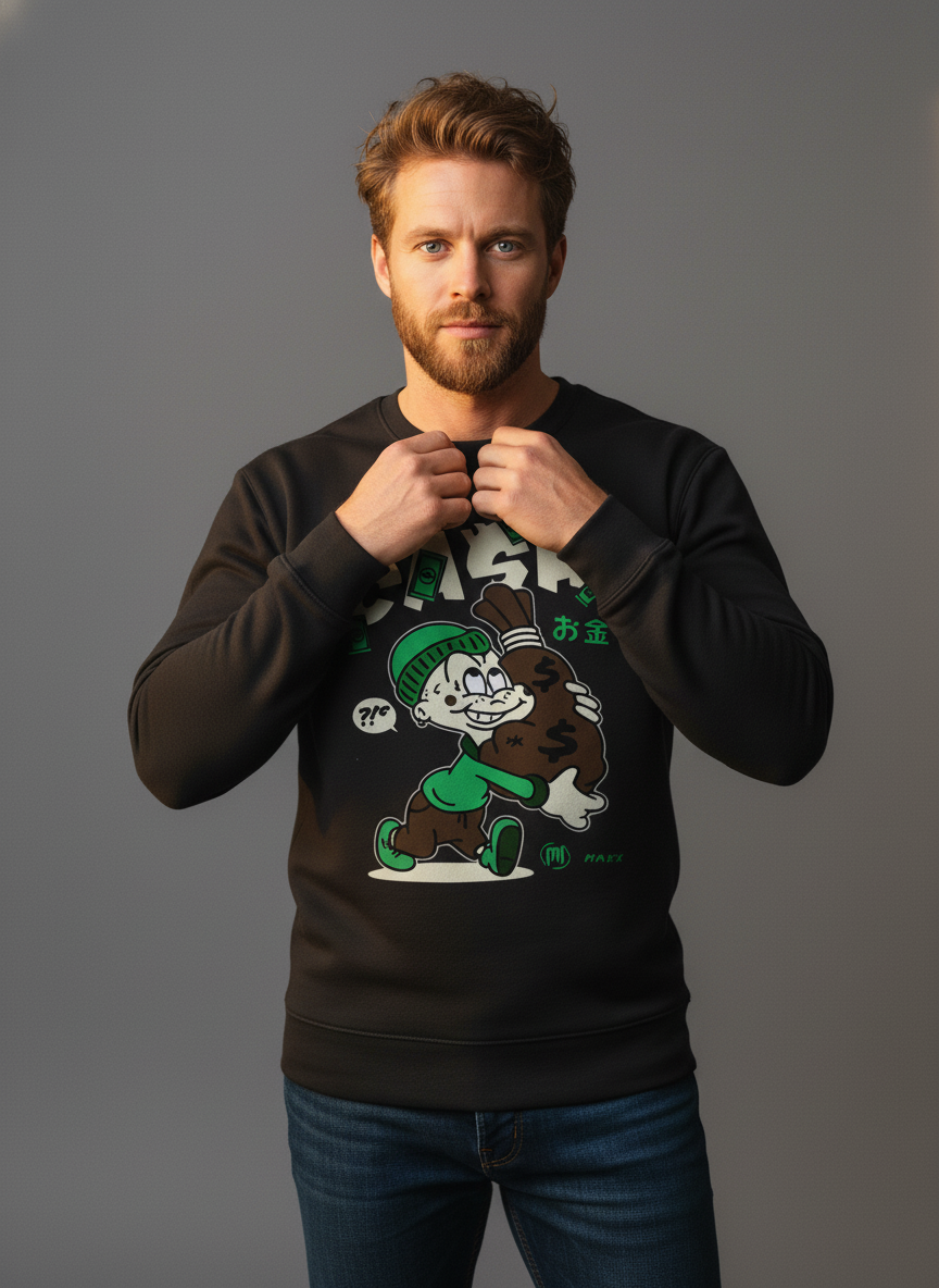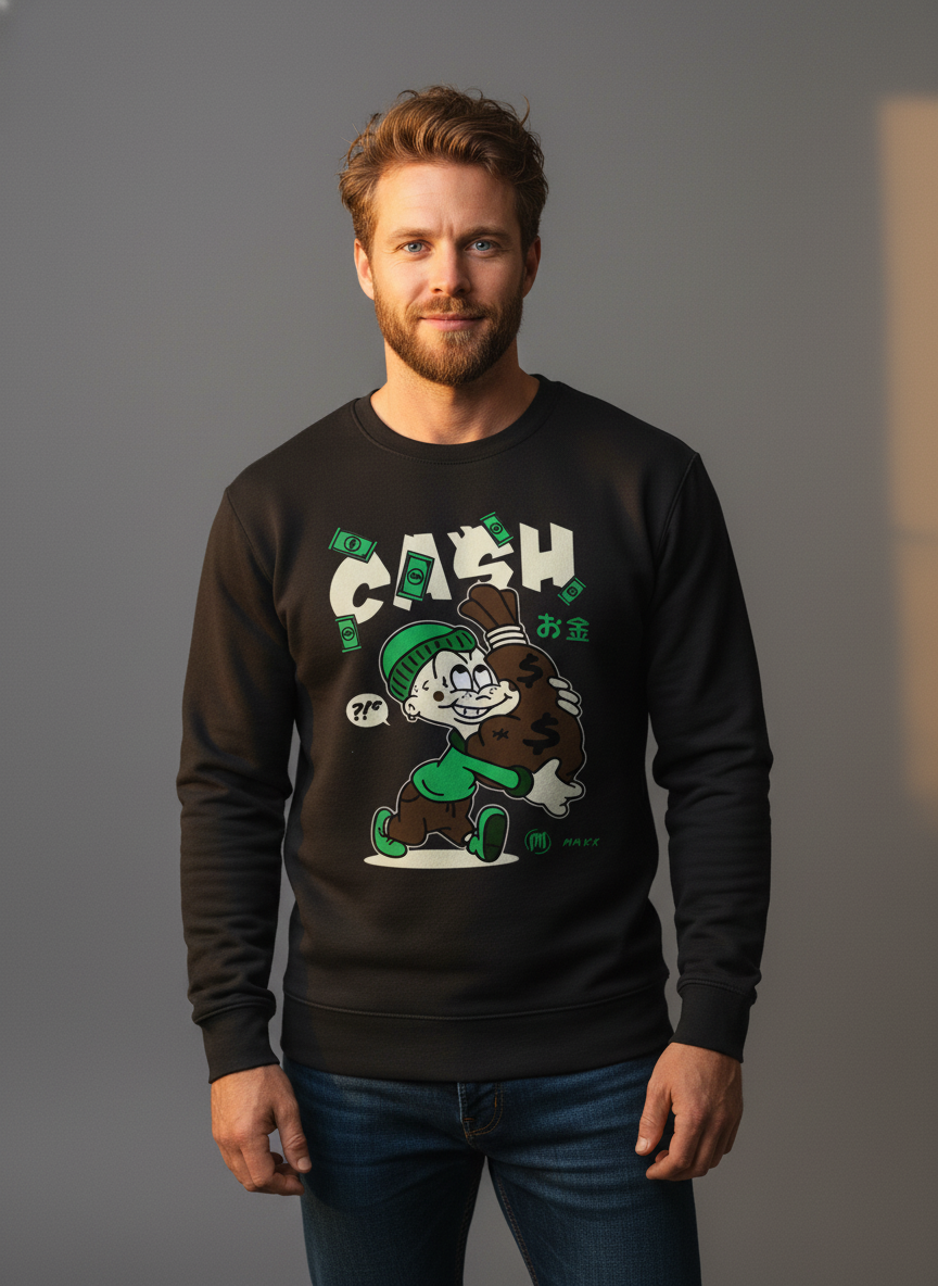 Secure the bag and stay cozy with the "CASH" Money Bag Cartoon Crewneck Sweatshirt. This bold black sweatshirt features a fun, ambitious graphic that is pure street savvy and cartoon charm.